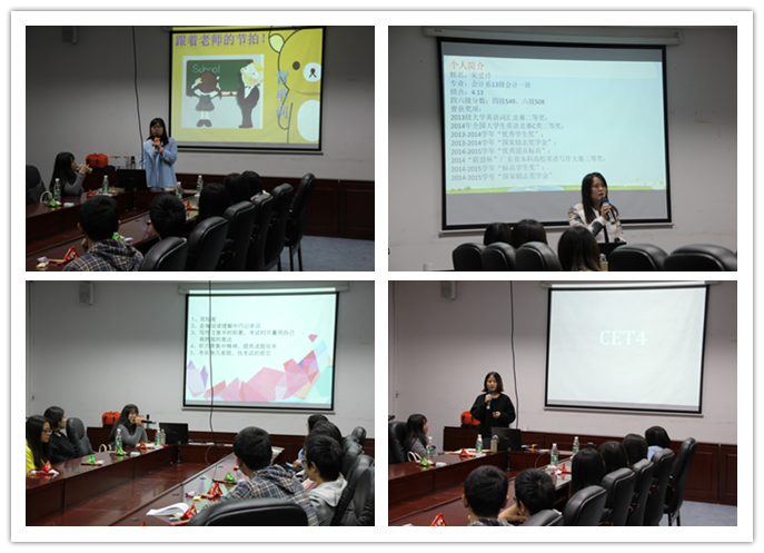 为了让会计系员工更好地学习英语,进一步提高英语四、六级考试的通过率。会计系团委于12月10日晚,在第二行政楼308会议室举行“向兴趣扬帆起航,为成长迎风破浪”的英语四、六级专题分享会。本次分享会邀请了在英语四、六级考试中获得优异成绩的同学进行经验分享,分别是13级审计2班的谭羽彤、13级会计1班的宋爱玲、14级会计10班彭美瑜和14级会计4班的郑欣圆。