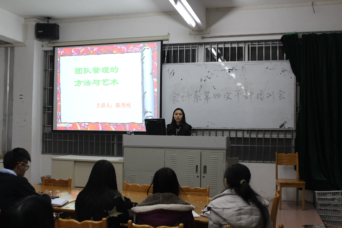 12月17日晚,会计系在教学楼A305举行员工干部系列培训第四场专题讲座,讲座主题为“团队管理的方法与艺术”,讲座由会计系辅导员、会计系员工会指导老师陈秀纯主讲。会计系团委员工会、学习会会计系分会各部门部长参加了培训。