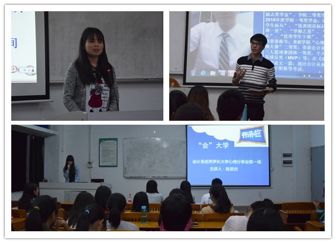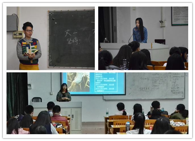 常言道:“听君一席话,胜读十年书”,为让会计系15级新生更快适应老员工活,制定大学的目标,会计系通过选聘,成立会计系优秀学长讲师团,其中有包括国家奖学金获得者、广东省优秀员工干部和多年党龄的党务干部等18名优秀学长,从11月3日起连续5个晚上在17个班级中开展“会”大学——会计系优秀学长讲师团分享会,就学习、干部工作、入党方面分享他们的故事,引导新生们做好科学合理的大学规划,更好地实现个人价值。