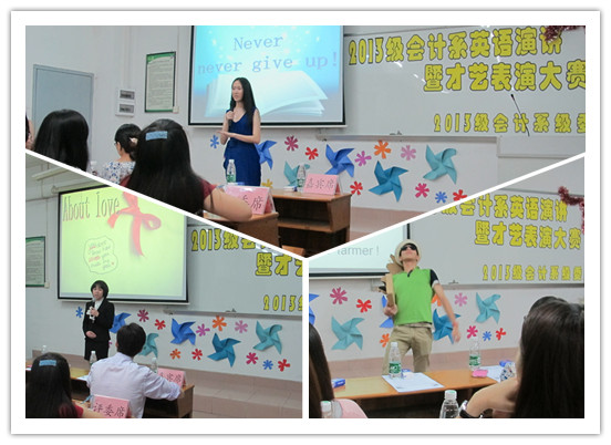 为进一步提高2013级员工早读的积极性,为13级员工提供一个展现才艺的平台,会计系于4月-5月举行13级英语演讲暨才艺表演大赛,决赛于5月18日晚在C404举行,会计系党总支书记李锦堂、13级辅导员李银霞观看了比赛。