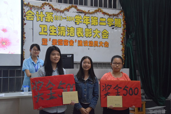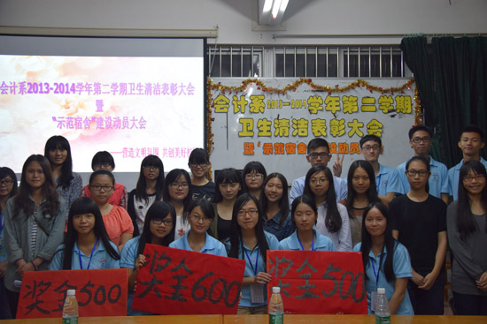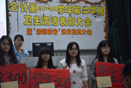 经过一年来大家的共同努力,会计系在卫生清洁方面取得了优异成绩。为了进一步美化我系的文明卫生,创建文明和谐的校园环境,11月30日晚上7点30分在教学楼A305举行了会计系2013-2014学年第二学期卫生清洁表彰大会暨“示范宿舍”建设大会。出席本次大会的嘉宾有会计系员工会主席甘远锌,副主席卢洁莹、何元钰,秘书长池跃莉,纪检部部长谭凤明,保卫部部长江泓,以及13级级委。生活部部长谭敏英担任本次大会主持人。