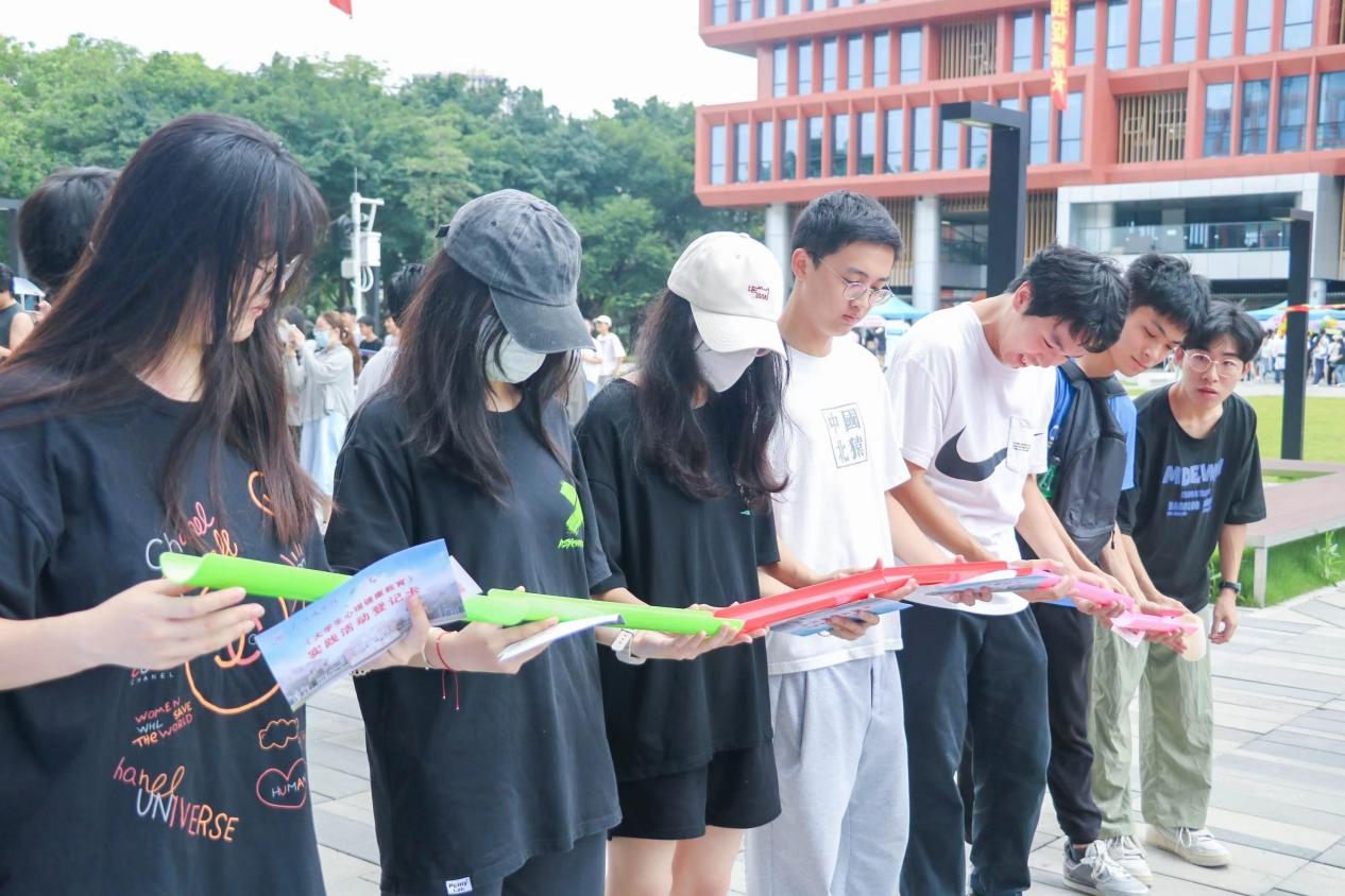 活动伊始,同学们用接力的方式把“能量球”运输到“终点杯”中,现场热闹非凡,摊位面前充满了同学们积极昂扬的笑声,热火朝天的气氛笼罩着整个场面。同学们用行动展现出健康向上的精神风貌,引发现场观众的呼喊称赞声,吸引了越来越多的学子参与其中,学子们在游戏中释放压力,缓解身心疲惫,提高了心理健康水平。