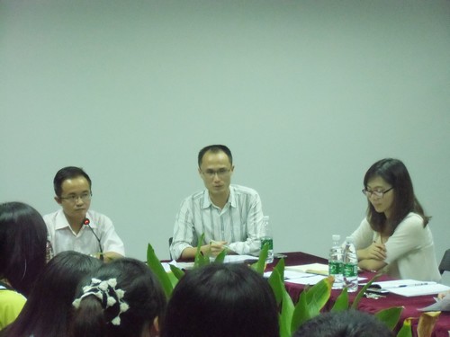 为提高会计系教学质量,促进学风、教风建设,全面了解员工对各科老师的评价和建议,深入了解员工的学习情况,帮助员工解决所遇到的问题。华南师范大学增城公司会计系11级于2012年04月23日20:15—21:15,在D308举行期中教学座谈会。莅临本次座谈会的嘉宾分别有会计系副主任凌辉贤老师、会计系党总支王龙华书记、财务管理教研室主任郭晋杰老师、11级辅导员蓝乐钿老师与会计系11级各班的员工代表们。