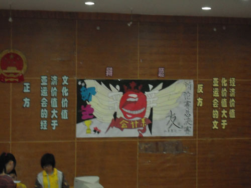 这场比赛在王超然老师短小精悍的致辞下隆重拉开帷幕,正方双方辩手也在主持人的介绍下闪亮登场。正方双方纷纷自信满满的向观众展示双方的决赛宣言,一场冠军宝座的争夺赛由此正式开始。正反双方就“亚运会经济价值大于文化价值/文化价值大于经济价值”这一辩题展开一系列精彩辩驳。双方都紧紧扣住自己的主线对对方辩友进行猛攻,现场的火药味不禁让在场嘉宾和观众精神抖擞,双方各自的啦啦队队员更是神情专注的观看这场不相上下的争夺赛。在整个辩驳的环节中,不论是正方还是反方的辩手,他们都发挥出了过人的才智和敏捷的思维,犀利的言语更是在场的所有观众折服。