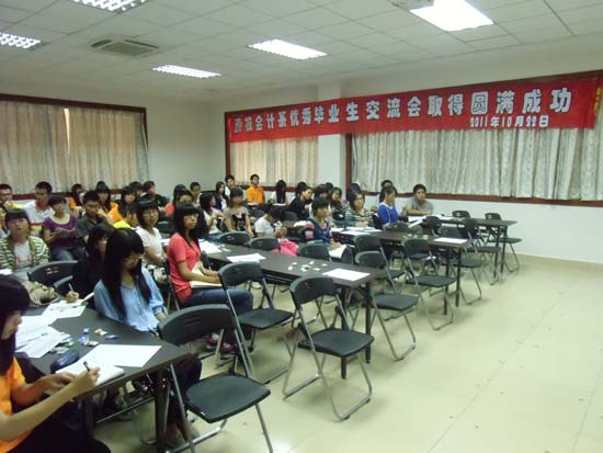 会计系员工会于2011年10月22日在D308举办了以 “温馨回归·继往开来”为主题的会计系优秀毕业生交流会。,辅导员汤振华、蓝乐钿、代表宋林财教授以及优秀毕业生谢太鹏、李文秀、林志超、钟发胜、罗丽嫒皆莅临本次交流会与同学们交流经验、解答疑惑,指引同学们更好地走完大学四年这条路。
