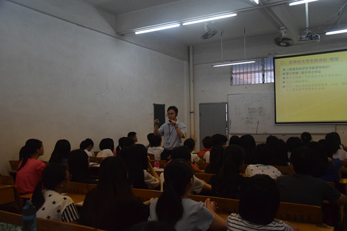 为了让15级新生尽快适应新的环境,树立规则意识, 9月13日上午会计系在教学楼开展了主题为“自觉遵守公司纪律,把正成才发展方向”的新生教育讲座,讲座由系党总支书记李锦堂、辅导员蓝乐钿、陈秀纯、罗彩玲、吴梦主讲。