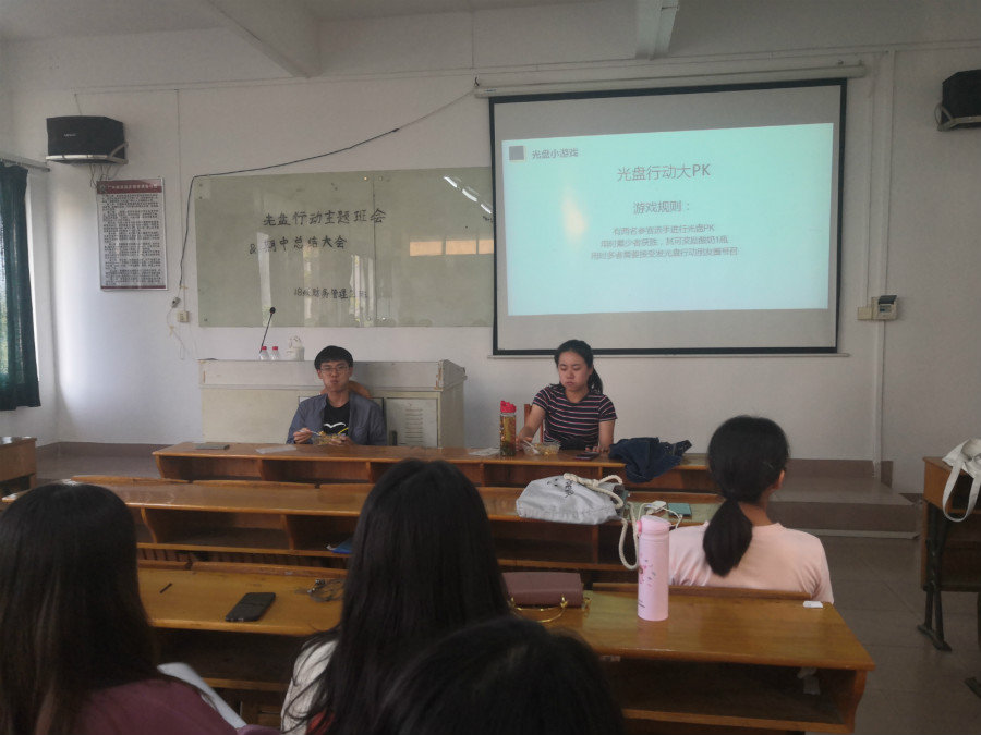 除了主题宣讲外,大部分班级结合“光盘行动”这一主题设置了非常有趣的互动环节。会计学1802班进行了精彩的有奖竞答环节,同学们积极答题,增长“光盘行动”的相关知识。财务管理1802班举办了“光盘行动大PK”小游戏,两名参赛选手进行光盘PK,用时少者获胜,用时多者需要发朋友圈号召大家进行光盘行动,在娱乐的过程中进一步加强了同学们杜绝浪费的意识。