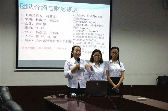 大赛开始,参赛团队先通过PPT对自己团队的创业理念进行介绍,评委再就此提出问题。每个参赛团队都从创立目的、项目计划、团队优缺点、商业模式、财务分析等方面为其项目进行了详细的讲解。各项项目都创意满满,体现了参赛者对项目的用心。在大赛中,杨明凤的“疯狂稻草人”团队所带来的“淘宝店长免费培训公司”项目不仅创意十足,而且也有了具体的实践;“北纬23°代运营有限公司”项目的团队也是一个已经有了实践经验的团队,可谓是为了比赛做足功课;樊建斌团队则提出了手工DIY黏土礼品的创意策划;黄彩虾团队则从“创客”入手,想要为各位创客提供法律咨询服务······每组参赛团队都很好地展示了自己的劳动成果,整个赛场气氛热烈、创意迸发。项目展示完毕,评委们对每组参赛团队都做出了提问和建议。同时,评委们特别提出在规划创业计划时各项专业知识都不可或缺,因为创业需要各方面都兼顾,这也说明了一个团队里需要拥有不同的人才,这样才能相互互补、共同促进。