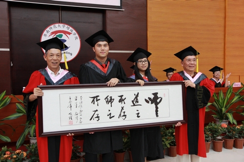 2012届毕业生献上代表445名毕业生心意的书画《道之所存师之所存》以及摆件《马到成功》给母校留念。随后,张蔚文主任致寄语,他首先向圆满完成学业的全体2012届毕业生表示热烈的祝贺,并深情的希望即将离校的同学们继续发扬大学期间养成的良好习惯,厚道诚实、勤奋踏实、节俭朴素,发扬华师增院人朴实的传统作风,在人生旅途上走稳每一步,母校和系里静候毕业生的佳音。