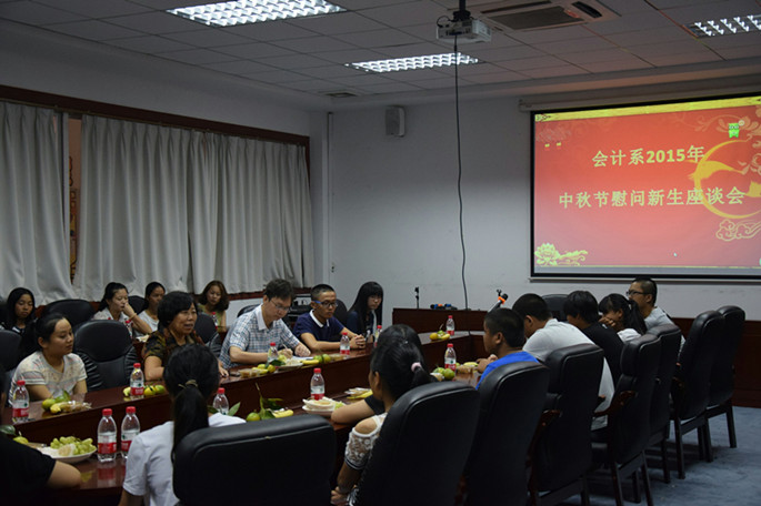 9月25日下午,会计系在第二行政楼D308会议室举行了中秋节慰问新生座谈会。会计系主任成慕杰、党委书记李锦堂、团委书记罗彩玲以及2015级18名外省员工和20名省内员工代表参加了本次座谈会。