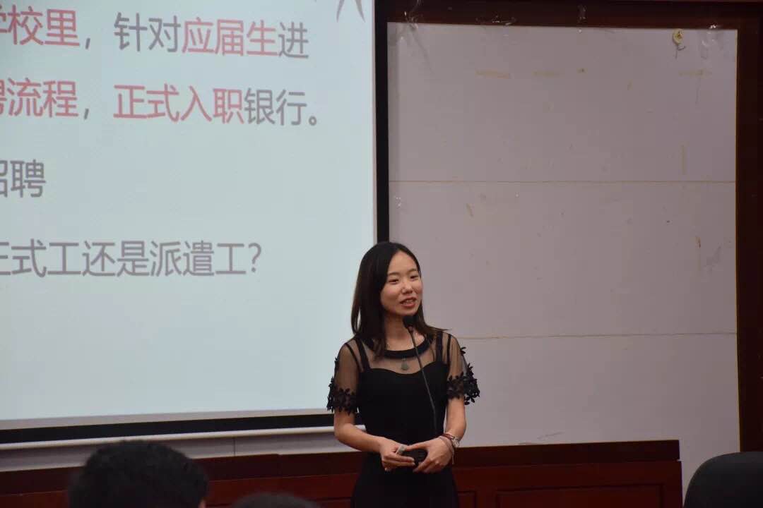 第二场有话职讲——银行专场分享会邀请了就职于珠海农村商业银行的李凯诗以及光大银行的吴伟强。李凯诗通过两段视频告诉大家银行校招及其注意事项,并强调对于应届毕业生而言,在春秋季的招聘中秋招更为重要。随后她还讲述了对于银行考试中笔试的考点概括、学习方法以及其他经验。吴伟强讲述了关于银行网络在线申请应聘的一般职位要求,以及在面试过程中涉及的问题。随后就客户经理方向提出了三点建议:一是提前做好规划,二是要端正心态,三是认真对待每一次的检验。