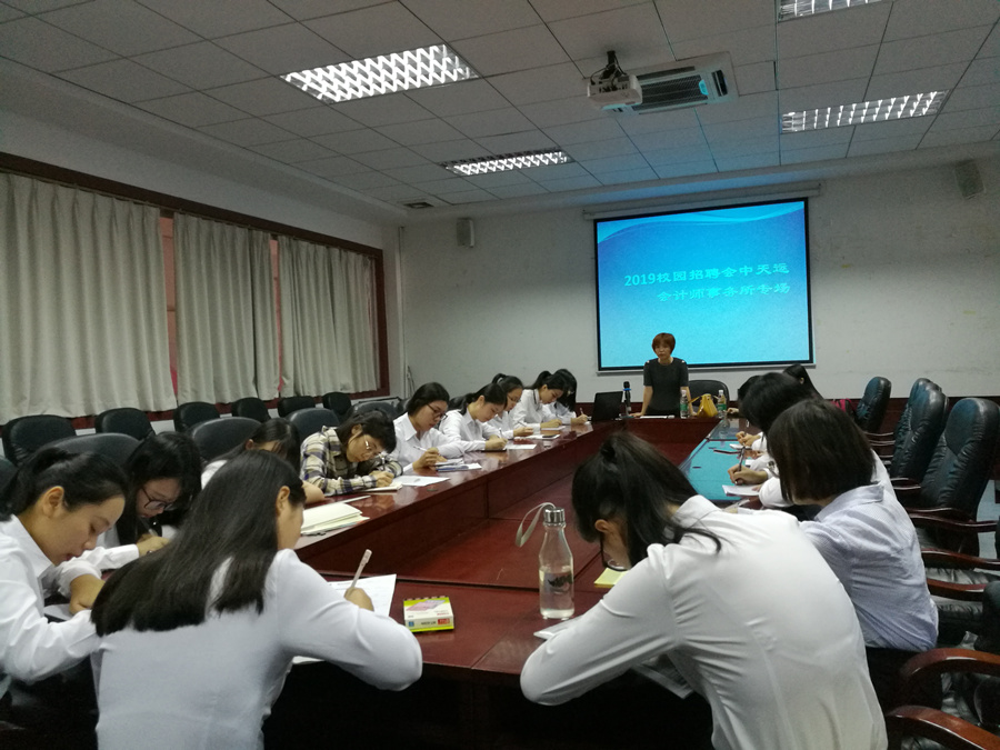 为更好地拓宽应届毕业生的就业渠道,做好就业服务工作,伟德国际1946bv官网15级在10月份针对全年级三个专业共1165名员工,做了求职意向摸底,根据员工的就业意向主动联系企业,并于11月6日早上9:00,邀请全国百强事务所中天运会计师事务所到公司开展专场招聘,事务所项目经理黎利玲到校参加招聘,共有30名同学参加。