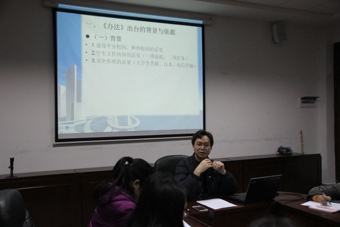 李锦堂介绍了《办法》出台的背景与依据,指出其在建设平安校园、和谐校园的重要性。《办法》的内容共12条,其中李锦堂特地提出要注意“重要信息”与“紧急信息”的定义和范围,希望各位干部能够明确两者区别,以便及时准确地报告。同时,他也提出了落实该《办法》的意见和建议,提醒干部正确处理好“信息”与隐私的关系,注意顾及他人隐私。希望各干部要勇于承担责任,主动了解、观察同学们的动向,及时确认各类信息的真实性;要充分考虑到各类事情发生的后果,权衡自己的能力再考虑是否将信息上报。最后,李锦堂给出了信息汇报的范例,提醒各位干部可按流程用多种方式上报。