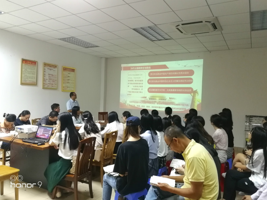 随后,陈德余以“责任担当,立德树人,做新时代人民教师”为主题,围绕责任担当是党员的基本素质、新时代对教师党员提出新要求、如何在实践中落实教师党员的责任担当等三方面内容讲授党课,并以赖湘兰、朱晓风、王宝田等三位优秀教师、党员代表的事迹为例,深入阐述上述内容。同时,陈德余引用习近平总书记讲话“坚持原则、敢于担当是党的干部必须具备的基本素质”,强调做四有好老师是老师责任担当精神的体现,做好四个引领“员工锤炼品格的引路人”、“员工学习知识的引路人”、“员工创新思维的引路人”、“做员工奉献祖国的引路人”,并旁征博引地诠释“心中有信仰,脚下有力量!”