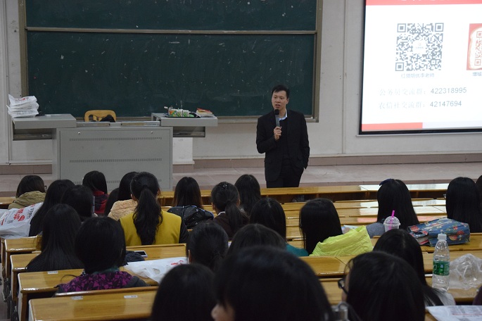 讲座开始,李志威首先围绕近几年来毕业季严峻的就业形势以及同学们毕业后的人生去向做了简单生动的介绍,并总结出我们一定要有确定的就业方向。在介绍毕业生的几项最常见的就业方向中,报考公务员的人数高达20%,该数据揭示了大部分毕业生在就业方面还是倾向于公务员。接下来,李老师又通过一串特殊的数字向我们阐述历年广东省公务员考试招录人数比例汇总分析以及考试时间、报名时间、笔试内容等公务员考试的重要事项。紧接着,李老师又为同学们详细的介绍了农信社以及农信社考试的一些具体的要求,并且提醒同学们公务员考试以及农信社考试的侧重点,传授了如何在有最短的时间内判断出最佳答案的一些相关答题技巧,建议大家学会提前备考和科学备考,并且为同学们介绍了几种备考的优秀渠道。