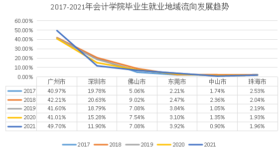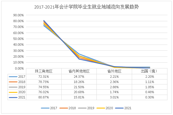 2021届毕业生就业地域大部分集中在珠三角地区,占80.87%,其中在广州市就业人数占已就业人数的49.7%,粤东西北地区15.81%,外省地区3.01%,出国出境0.3%。